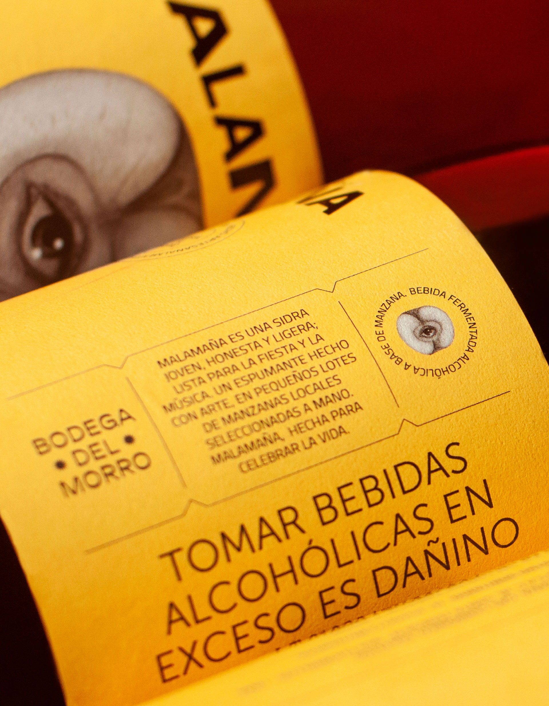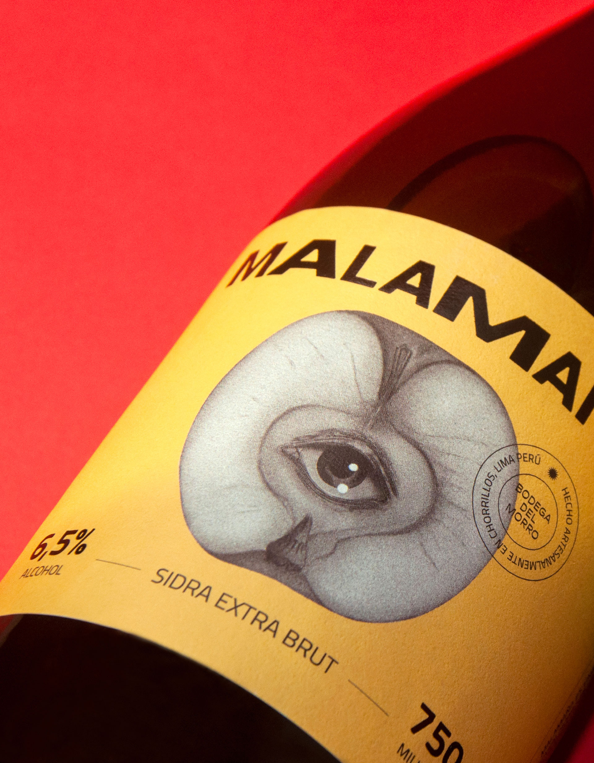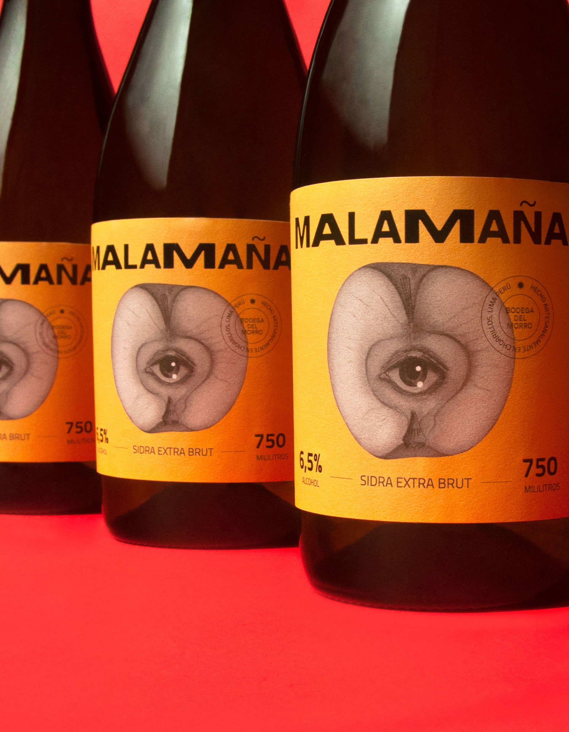 Con el nombre definido, diseñamos un empaque que reforzara su identidad audaz. La manzana, su insumo base, es el centro de la composición. Presta sus colores a las etiquetas y protagoniza una ilustración vibrante con un ojo en medio que funciona como una premonición de la experiencia Malamaña.